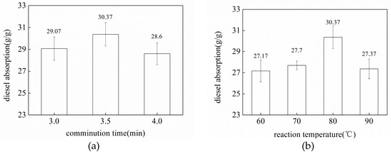 In order to investigate the influence of physical and chemical treatment on the oil absorption performance of the corn stalk fibers, the comminution time for the physical treatment in the high-speed multifunctional crusher was selected to be 3, 3.5, or 4 min. In the chemical modification of corn stalk fibers, sodium hydroxide is commonly used for pretreatment. In these experiments, the mass fraction of the sodium hydroxide solution was 0.25%, 0.5%, 1%, or 2%, the reaction temperature was 60 °C, 70 °C, 80 °C, or 90 °C, and the reaction time was 15, 30, 45, or 60 min. The diesel absorption performance of the treated corn stalk fibers is shown in Figure 10.