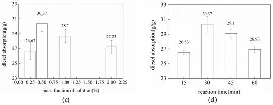 When the comminution times in the high-speed multifunctional crusher were 3, 3.5, and 4 min, the absorption capacity of the pretreated corn stalk fibers for diesel oil was 29.07, 30.37, and 28.6 g/g, respectively, which represents an initial increase and then a decrease. As the reaction temperature used in the pretreatment increased, the oil absorption performance of the corn stalk fibers exhibited an increasing trend and reached a peak capacity of 30.37 g/g at 80 °C, from which point it started to decrease. As can be seen from Figure 11c, when the mass fraction of the sodium hydroxide solution was 0.25%, 0.5%, 1%, and 2%, the oil absorption capacity of the pretreated corn stalk fibers was 26.67, 30.37, 28.7, and 27.23 g/g, respectively. It can be seen that at a mass fraction of the solution of 0.5%, the oil absorption performance of the corn straw fibers was the highest (capacity of 30.37 g/g). Figure 11d shows that the effect of the pretreatment reaction time on the oil absorption capacity of the corn stalk fibers was similar to the effect of the mass fraction of the solution. When the reaction time was 30 min, the oil absorption capacity of the straw fibers was the highest (30.37 g/g), after which it displayed a downward trend.