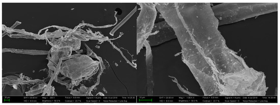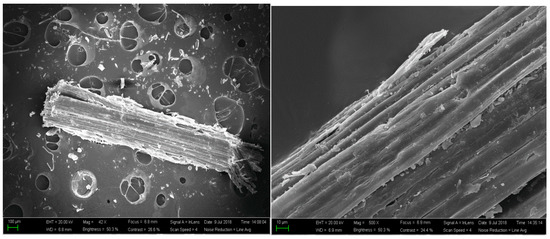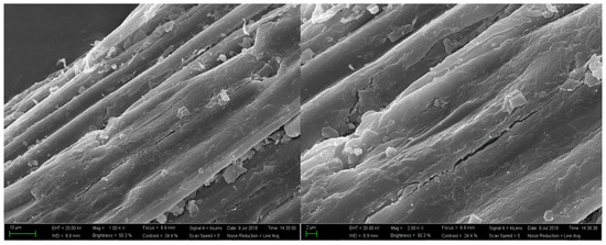 In this experiment, scanning electron microscopy was used to characterize the micromorphology of corn stalk fibers before and after treatment with the sodium hydroxide solution. In addition, the morphological changes were observed under different magnifications. The method of sample preparation was as follows: the most macroscopically similar fibers in a sample were selected and pasted directly onto conductive adhesive tape to ensure that the fibers were completely connected to the conductive metal. Then the surfaces of the sample were sprayed with gold for 10 min for testing.