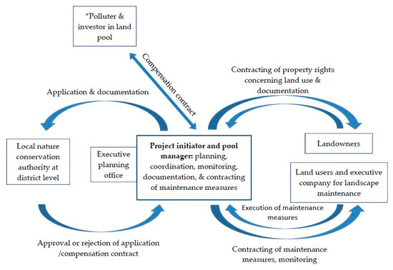 Figure 3. The pool manager concludes contracts with the investor (polluter), the authorities, the landowners, the executing company (e.g., a local farmer), and the planning office in order to offer the provision of land and to plan, coordinate, document, and monitor maintenance measures.