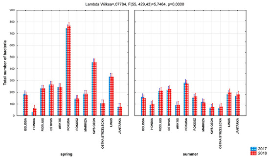 In addition, significantly higher overall bacterial counts were found in rhizosphere soil in the spring compared to the summer (Figure 1). A higher total bacteria number was observed, among others in the rhizosphere soil of the varieties Pokusa, KWS Ozon, Linus and Arktis in the second phase of sampling (summer). In the summer the highest total bacteria number was found in the rhizosphere of wheat varieties, i.e., Pokusa (283.7 × 107 CFU/g d. m. of soil), Estivus (224.4 × 107), Fidelius (211.4 × 107), Linus (193.1 × 107) and Jantarka (174.7 × 107) (Figure 1).