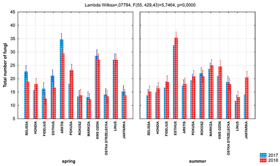 Similarly to bacteria, soil fungi in the first stage of sampling (spring) also occurred most frequently in the rhizosphere of the Arktis variety (32.0 × 104 CFU/g d. m. of soil), KWS Ozon (27.8 × 104) and Linus (27.0 × 104) (Figure 2). However, such varieties as Jantarka and Hondia were characterized by significantly lower populations of fungi, from 14.4 × 104 to 16.7 × 104 CFU/g d. m. of soil for the variety, respectively. The highest number of fungi in samples collected in the summer was found in the soil of the winter wheat variety Estivus (33.8 × 104 CFU/g d. m. of soil). In addition, there was a significantly higher total fungi number in the rhizosphere soil in the first phase (spring) of soil samples collection as compared to the second phase (summer) (Figure 2).