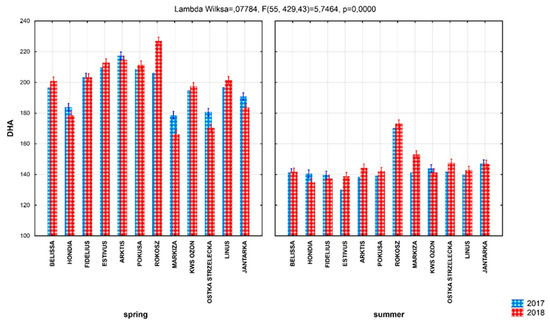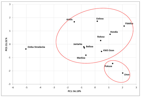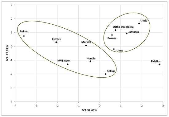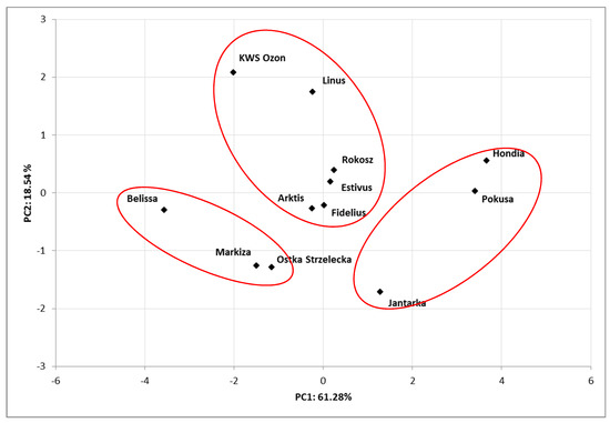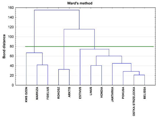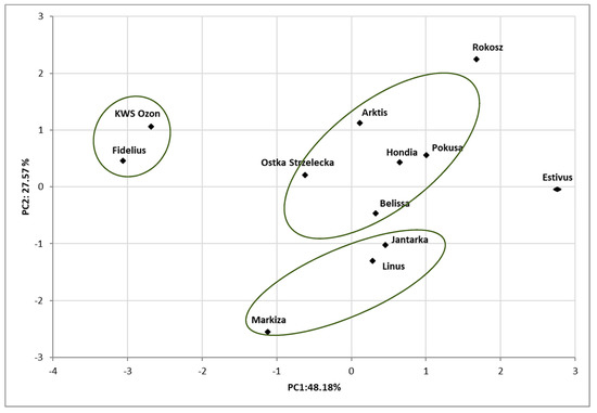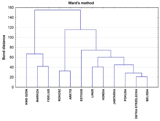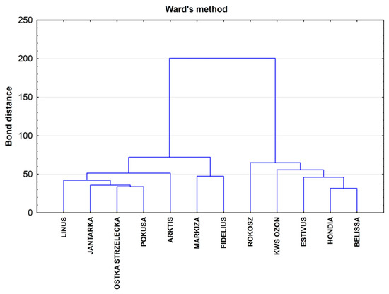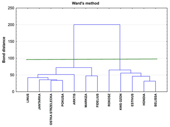 On the basis of cluster analysis (66% Sneath’s criteria), three main groups were isolated (Figure 8). The first group includes the following varieties: Linus, Jantarka, Ostka Strzelecka, Pokusa and Ozon. The second group includes the Markiza and Fidelius varieties. In the third group, the following varieties were determined: Rokosz, KWS Ozon, Estivus, Hondia and Belissa (Figure 8).