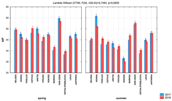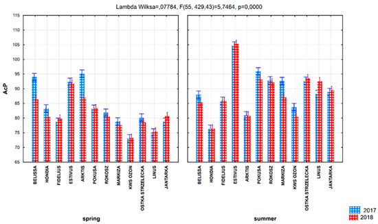 On the other hand, the highest alkaline phosphatase activity was found in the rhizosphere soil collected in spring of KWS Ozon cultivar, but higher alkaline phosphatase activity was also observed in this season in soil under varieties such as Hondia, Estivus and Arktis (Figure 5). In soil collected from rhizosphere soil in summer the higher alkaline phosphatase activity was found in the rhizosphere soil such varieties as Hondia, KWS Ozon and Jantarka. Additionally, the higher alkaline phosphatase activity was observed in soil collected from varieties Belissa, Fidelis, Markiza and Linus.