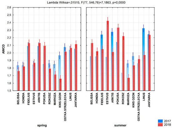 - The highest AWCD value was found in the samples collected in the summer under the cultivars of Estivus, Pokusa and Jantarka. The lowest AWCD value was found in soil samples collected from the varieties of Markiza and KWS Ozon.
