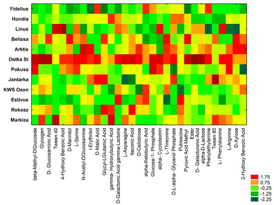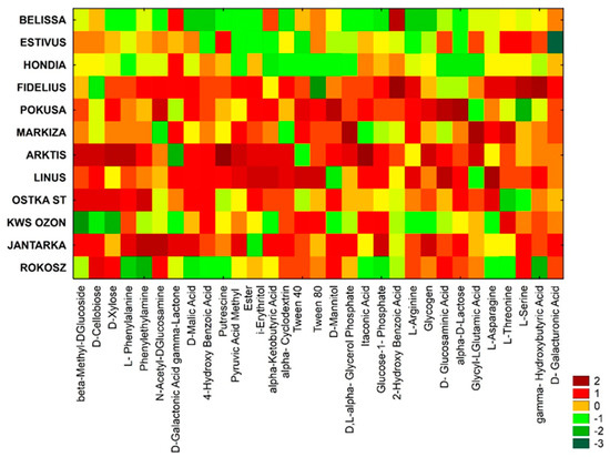 From the 31 different carbon sources, the highest rates of substrate utilization were recorded for the spring rhizosphere soil collected from winter wheat varieties in 2018 such as Arktis, Fidelius, Ostka Strzelecka, Jantarka, Pokusa and Linus (Figure 9). The D-Gluconic Acid gamma-Lactone, Glucose-1-Phosphate, Putrescine, L-Threonine, Glycyl-l-Glutamic Acid, Glycerol Phosphate, L-Serine, L-Asparagine, and D-Malic Acid were the most commonly utilized substrates (Figure 9). The current study revealed that carbohydrates and amines/amides were characterized by the highest metabolic activity, while the lowest activity was determined for polymers. Cluster analysis, including grouping of the treatments and features, was performed on standardized data from the average absorbance values at 144 h (Biolog EcoPlate). The dendrogram was prepared with scaled bond distances on the axis (Ward’s method) and boundary marked according to 66% Sneath’s criteria. Based on Ward’s cluster analysis, two main groups were distinguished for samples collected in spring (Figure 10). The first group included winter wheat varieties such as Linus, Jantarka, Ostka Strzelecka, Pokusa, Arktis, Markiza and Fidelius, while the second group included Rokosz, KWS Ozon, Estivus, Hondia and Bellisa (Figure 10).