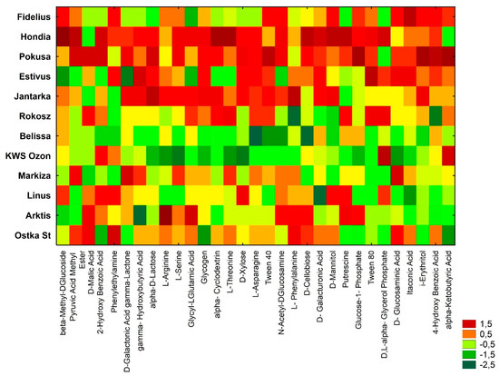Based on Ward’s cluster analysis, three main groups were distinguished for samples collected in summer (Figure 14). The first group included such winter wheat varieties such as KWS Ozon, Markiza and Fidelis; the second group with the highest activity included such varieties as Rokosz and Arktis. The third group included such varieties as Estivus, Linus, Jantarka, Pokusa, Ostka Strzelecka and Bellisa.