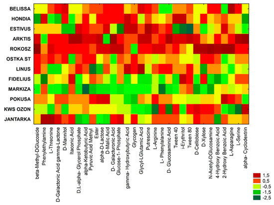 Microbial diversity of rhizosphere microorganisms in soil collected on spring 2017 from various winter wheat varieties cultivated in organic farming, (n = 3). HeatMaps for the carbon utilization patterns of the 31 substrates located on the Biolog EcoPlates data incubated for 144 h from soil samples.