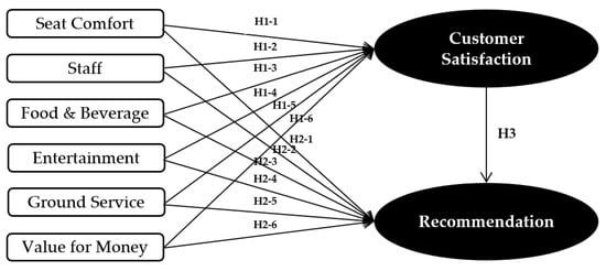 For the quantitative analysis, the evaluation data on six factors (seat comfort, staff, F&B, entertainment, ground service, value for money) with customer satisfaction and recommendation from Skytrax (airlinequality.com) were collected. Using the SPSS (IBM, Armonk, NY, USA) Statistics program, it conducted a linear regression analysis and verified the impact of each factor and the customer satisfaction. In addition, the relationship between customer satisfaction and recommendation was analyzed. For verification, a research model was established as shown in Figure 2.