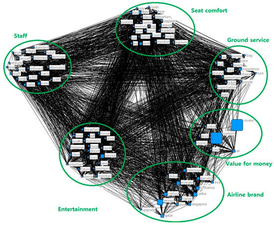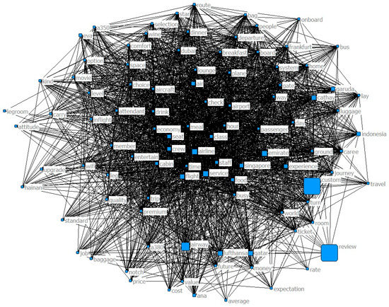 The analysis of this study, as shown in Figure 1, carried out the following process to identify the frequency and importance of keywords for the recognition of airline passengers [44]. The first stage was going to be collecting the review data online and refining the collected text. As for the data analysis, Ucinet 6.0 packaged with Netdraw, which is a visualization tool. The Netdraw is an illustration program to express how the frequent words are related and make an impact with certain interaction. It is mainly concentrated on the semantic network analysis about the extracted top 100 frequent keywords from raw data. After that, the centrality analysis of Freeman’s degree has been worked out for refining the meanings of connection between the top 100 frequent words.