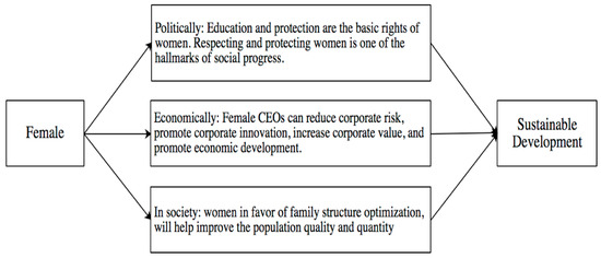 Second, in terms of economics, female CEOs can reduce corporate risk, promote corporate innovation, increase corporate value, and promote sustainable economic development. At the enterprise level, the executive ladder theory [12,13] holds that the heterogeneity of the executive’s characteristics affects corporate policies, risks, and performances [14]. In light of the relationship between women and a company’s sustainable development, on the one hand, women constitute an important part of corporate governance from the inside and increasing the number of women on the board of directors raises the value of enterprises [15]. Female CEOs have improved the performance of businesses [2]. In companies under complex environments, when the proportion of female executives is high, it can indeed produce positive and significant returns [16] compared to other companies with fewer female executives. At the same time, female CEOs promote corporate technological innovation more than male CEOs [9]. On the other hand, as for the outside the company, the increase in the number of female executives improves the quality of corporate information disclosure [17]. Therefore, the female CEO is conducive to improving the enterprise’s value, promoting its innovation, and ensuring its sustainable development.
