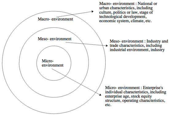 We believe that the environment is a collection of factors that influence and constrain the production and operation activities of enterprises. The environment includes not only the individual micro-environment, but also the macro-environment such as the country, and the meso-environment between individuals and countries [20]. Therefore, according to the sphere of influence of the environment, the environment can be divided into micro factors, meso factors, and macro factors [19,20]. In this essay, the micro-environment mainly refers to the internal characteristics of the enterprise, including the age and scale of the enterprise, shareholding structure, the scope of sales of the products, etc. The meso-environment refers to the characteristics of the sector and industry, including the market environment and competition order. The macro-environment mainly includes the characteristics of a country or city, specifically containing economic level, political level, cultural environment, etc., as shown in Figure 3.