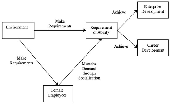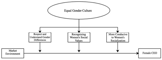 As shown in Figure 4, the environment has a major impact on the gender of the CEO. First, the environment calls for new requirements on enterprise development. Changes in the environment have forced enterprises to adjust their business strategies to meet the requirements of their development, and those that actively respond to changes in the external environment are the ultimate successful enterprises. Therefore, the environment can impose new requirements on CEO abilities, in which only those who meet the new requirements can become CEOs. Second, the environment is the implementer of women’s socialization. In the process of women’s socialization, families, schools, work units, newspapers, books, movies, and networks are all providers of women’s socialization, and they are all part of the environment.