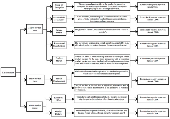 The research findings are as follows. (1) The environment in which enterprises are located has a significant impact on CEO genders. In the corporate micro-environment, compared with other factors, enterprise size, state-owned shareholding, product features, industry characteristics, and female owners have significant impacts on female CEOs. In the industry meso-environment, the market environment is more important, yet it has a significantly negative impact on female CEOs. In the macro-environment, the radiation effect and gender culture have significantly impacts on female CEOs. (2) As far as the mechanism of action is concerned, CEO genders are by no means impacted between various environments separately, but there is a kind of regulating effect. The gender culture in the macro-environment has a positive regulating effect on the market environment in the industry environment.