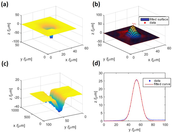 Confocal topographies and fitting results to obtain depth and width dimensions. (a) hole topography and (b) 2D Gaussian fit. (c) groove topography and (d) and 1D Gaussian fit.