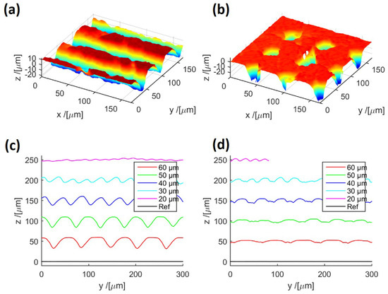 The reconstruction of the surface topography obtained with confocal microscope is shown in Figure 5a,b and transverse profiles of the structures induced, with different pitch, are shown in Figure 5c,d. It can be observed how the texture pattern diffuses with the overlapping, i.e.; decreasing pitch, especially in case of the groove patterns (Figure 5c).