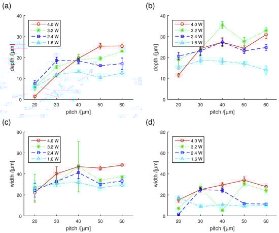 Depth and width versus pitch. (a,c): treated with grooves. (b,d): treated with holes.