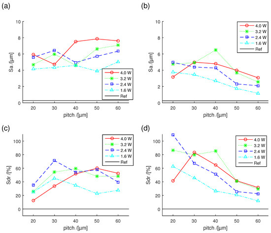 Results of the surface roughness parameters and are shown in Figure 7. In the case of the grooves, mean roughness, , seems to increase as the pitch increases, but in the case of holes the opposite occurs; increases as the pitch decreases. This behavior of can be attributed to the increment of the texturing density, while maintaining low overlapping in the generated structures.