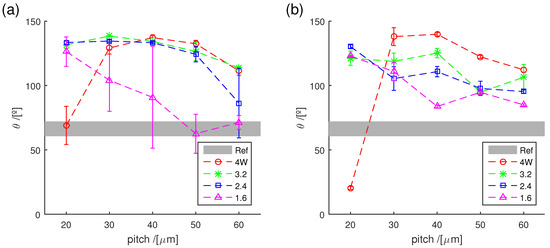 Focusing on the treatment with grooves, for all the values of the laser power applied (except ), the highest contact angles correspond to pitch values in the range 30 – 50 , which correspond to a separation between lines or holes in the order of the laser spot diameter ( 40 ). Regarding the case of the lower power used, , the contact angle decreases as the pitch increases; but, it should be taking into account the large dispersion of the data. From Table 3, it can be seen that the power at which the highest contact angle is obtained, corresponds to ( 30 ), being the average of the maximum contact angle values obtained with the four laser power used.