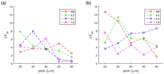 Regarding color variations caused by laser texturing, the lightness, , was the most affected parameter, showing increases, in all the textured surfaces, in the range 0.2–7.8 CIELAB units. The color coordinates and did not show notable changes: from −0.16 to 3 in and from 0.6 to 1.7 in . Therefore, nor and experimented noticeable changes. Then, global color change () was directly related to variations. In Figure 9, the global color change, as a function of the textured pitch, at different values of the laser power are depicted. Moreover, in Table 3, values that correspond to the textured patterns which gave the highest contact angles are indicated.