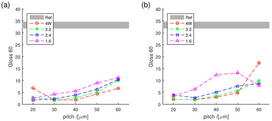 Figure 10 shows the gloss values after texturing with grooves and holes applying different laser power and pitch. The value of gloss for the reference surface (gray band in the figure) is ; this value reflects the polishing finish of the sample. The texturing with both grooves and holes reduces the gloss. In addition, it is observed, as expected, that the higher the distance between holes or grooves the lower the reduction on the gloss. Furthermore, it can be seen that the laser power applied has a remarkable effect on the gloss; the greater the applied power, the lower the gloss of the textured surfaces.