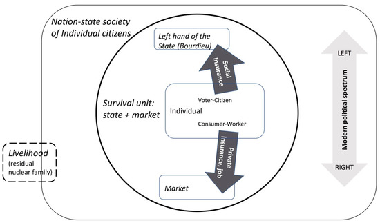 To recap, from Polanyi [9], we have an account of disembedding of the economy involving the dispossession of peasants and the forcible creation of a society of spatially and socially mobile individuals. From Gellner [20], it becomes clear that literacy through exo-education becomes the most significant vehicle for the imposition of a unitary ‘high culture’—both in allowing the emerging market economy to function efficiently and by smoothing the barriers to capital and labor mobility. From Ong [17], it is equally clear that mass literacy has had a transformative impact on the consciousness and personality structure of people in technically advanced societies. And finally, from both Polanyi and Elias [12,16], we have a persuasive account of the way in which the resulting society of individuals is predicated upon, and requires, a very different kind of survival unit (Figure 1; Box 1). Specifically, having sundered the communitarian bonds of reciprocal care and obligation, modern individuals became quickly both dependent on and vulnerable to the capricious cycle of market forces. Through decades of institutional innovation, political agitation and elite compromise, modern societies have become defined by a new survival unit—that of the State–Market (see Figure 1).