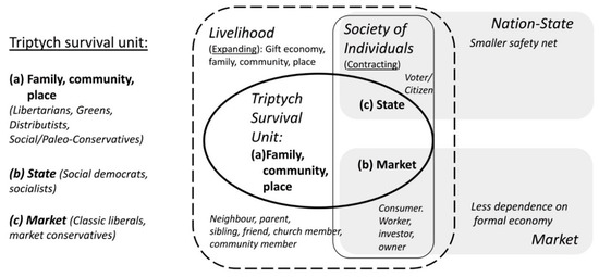 In what follows, we argue that any effective agenda for ecological economics as a discipline, and the sustainability movement more generally, must attend to the potential of Livelihood to act as a disruptive ‘third leg’ within an ecological political economy. Socially and spatially mobile modern individuals depend, for the first time in human history, on a ‘survival unit’ based on an amalgam of both State and Market. The opposition between State and Market in contemporary left–right politics obscures the symbiotic relation between these institutional and ideological poles, both of which require economic growth to secure material and social wellbeing. The reassertion of Livelihood—i.e., the household, the informal/DIY economy, and the culture and rituals of reciprocation—is disruptive in that it both precludes many cherished policy commitments associated with social democracy, whilst opening up opportunities for political–economic transformation that have greater overlap with anarchist, paleo-conservative, religious and libertarian traditions. Building on ideas developed in a sequence of papers published over the last five years [1,2,3,4,5,6,7,8] and taking a cue from both Polanyi and the early Herman Daly, this paper will argue that Livelihood is a foundational domain—necessary to reign in both State and Market, and to create a ‘three-legged’ political economy for an alternative modernity. Grounded in a triptych survival unit composed of Livelihood, State and Market, this alternative political economy has the potential to realize many of the ecological and social goals championed by ecological economics and the broader field of sustainability. Making this adjacent possible a reality, however, requires a more nuanced understanding of the complex tensions involved in rebalancing the domain of Livelihood with the interconnected domains of State–Market and cannot be accomplished without drawing insights from across the ideological landscape. This paper expands on our previous work by identifying the basis for a more fruitful discussion between small-c conservatives on the one hand and social-democratically minded greens on the other. Since any real paradigmatic, peaceable transformation toward a sustainable society would require bringing a critical mass of the population in high-income countries on board, and given the populist shift we are currently witnessing all over the world, this is a conversation that sustainability advocates cannot afford to avoid. For ecological economics more specifically, this conversation is necessary if the discipline aims to reconcile the dilemmas of political, economic and societal organization with global ecology and sustainability.