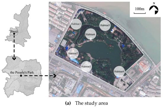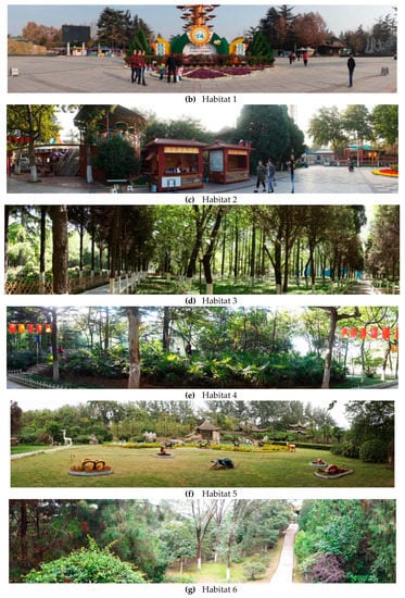Figure 1). After a comprehensive field survey of the green spaces was conducted with varying vegetation structure and main landscape features of the People’s Park, six typical types of habitats were selected with similar sizes (