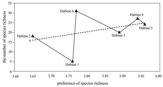Table 2), of which 119 were conducted in Habitat 1 (119), 133 in Habitat 2 (133), 269 in Habitat 3 (269), 109 in Habitat 4 (109), 270 in Habitat 5 (270), and 189 in Habitat 6 (189). Through field investigation and statistical analysis, the species richness (NVPS) of the six habitat types was obtained; the habitats were ranked from lowest to highest including Habitat 1 (5 species), Habitat 2 (18 species), Habitat 3 (20 species), Habitat 4 (24 species), Habitat 5 (27 species), and Habitat 6 (31 species) (