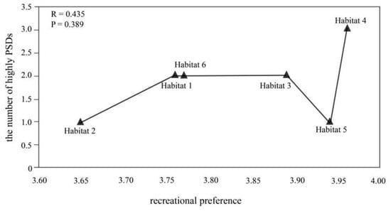 In order to identify the relationship between recreational preference and recreational values of environment in different habitats, correlation analyses between preference and the number of highly rated PSDs in each habitat were conducted (