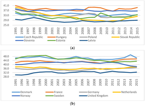 The evolution of tax revenues over the period 1995–2015. (a) panel of CEE countries; (b) panel of developed countries.