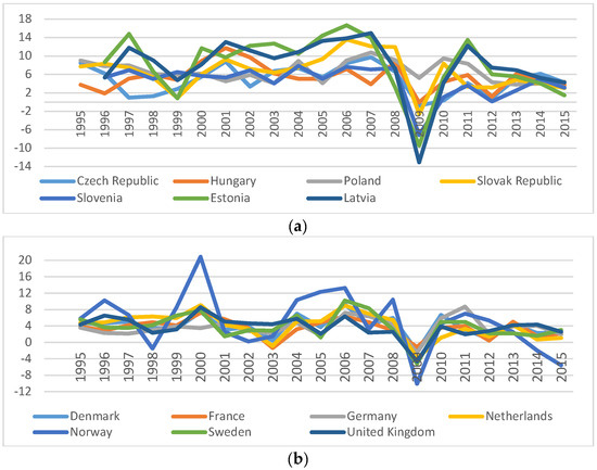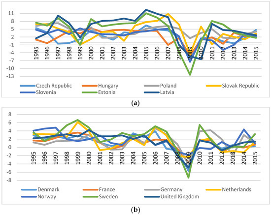 The evolution of Gross Domestic Product (GDP) over the period 1995–2015. (a) panel of CEE countries; (b) panel of developed countries.