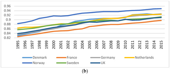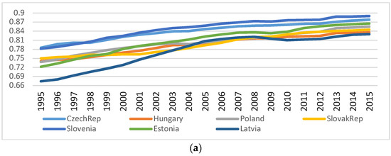 The evolution of HDI over the period 1995–2015. (a) panel of CEE countries; (b) panel of developed countries.