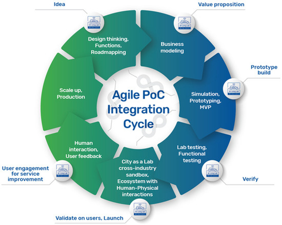 This one-stop ecosystem environment approach shortens the development and deployment cycle and enables faster entrance to the market with more robust and already tested solutions. It also provides an intelligent showcase for analyzed use cases that can be demonstrated to potential customers. Figure 2 presents the agile proof of concept (PoC) integration cycle in AV Living Lab from idea, value proposition generation, prototyping, verifying the prototype, validating the prototype with users and engaging users for service or solution improvement [70].