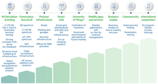 With a high number of daily visitors in a real-life environment, the AV Living Lab is solving one of the key issues in today’s development and innovation process—rapid prototyping, testing, and validating. The AV Living Lab offers infrastructure to move solutions (or prototypes) from technology readiness level, validated in laboratory (technology readiness level 4-TRL4) into relevant real environment validation (TRL5) or demonstration (TRL6) within a context of a smart city. Beyond that, it enables long-term operational demonstrations in interactions with other industries (TRL7). Complete system qualification in a real smart city environment (TRL8) enables testing of solutions for the next step towards the market (TRL9) [69]. The whole smart city ecosystem is composed of physical infrastructure, businesses and people and is overlaid with a multitude of data flows, augmented with sensors and actuators on the main physical assets to monitor and manage the operation securely (Figure 1). As such, AV Living Lab offers full infrastructure for the autonomous vehicle driving experience, artificial intelligence, cybersecurity, blockchain with retail applications, infotainment and vehicle-to-anything communication [70].
