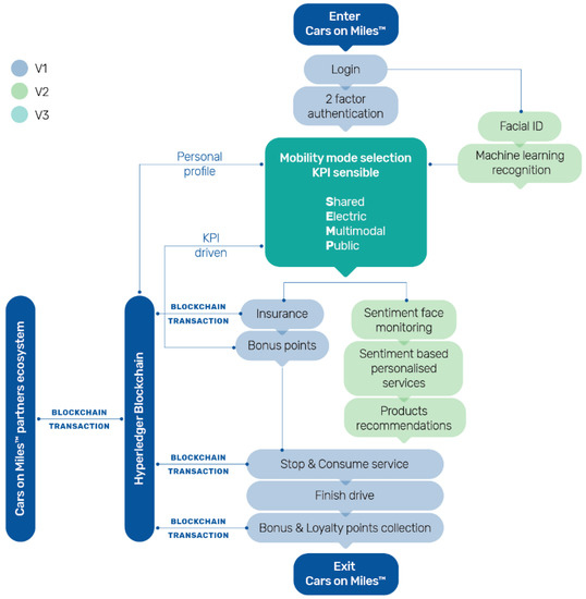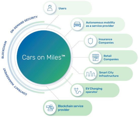 One of the first prototypes developed in the AV Living Lab is Cars on miles. Cars on miles is a prototype solution that provides proof of concept for a blockchain-based mobile application. This application connects users with service providers of autonomous mobility, insurance companies, retail companies and wellbeing providers, smart city infrastructure, electric vehicle (EV) charging operator and blockchain service provider. Application infrastructure supports cooperation based on smart contract management, blockchain technology and on-demand security (Figure 4).