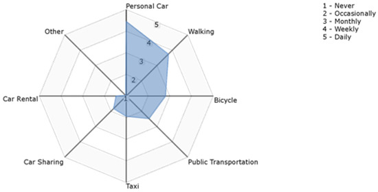 Participants were asked about the means of transportation they were using in their daily life. There were seven different means of transportation listed in the question: car, walking, bicycle, public transport, taxi, car renting and car sharing. Participants were asked to mark the frequency of the transportation use on the scale from 1 to 5, where 1 = Never, 2 = Occasionally, 3 = Monthly, 4 = Weekly, and 5 = Daily. Results showed that most convenient personal transportation means of respondents is a private car with the average mark of 4.5 (out of 5), walking is the second most frequent with average of 3.7, bicycle is the 3rd most commonly used option with average of 2.8, public transportation is represented with average 2.5, and Taxi with 1.9. The least used means of transportation were car sharing with 1.8 and car rental as last marked with an average of 1.5 out of 5 (Figure 7).