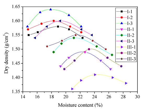 In this paper, standard compaction tests were carried out to determine the maximum dry densities and the optimum moisture contents of the stabilized loess on all mix ratios following procedures described in ASTM D698 []. The mix ratios are as shown in Table 5 with proposed binder contents (lime + slag) of 20%, 30%, and 40% and classified under the category of I (80% of loess), II (70% of loess), and III (60% of loess), respectively. According to the proportion in Table 5, the dry mixture was mixed using a cement mortar mixer. The required amount of water was then added to the dry mixture, and the fast mixing process was continued until a uniform mixture was obtained. Distilled water was then added to the mixture at an increment interval of 2% moisture content by dry weight of soil to establish its compaction characteristic between each scenario. Moisture contents thus cover the range between 14–22%, 13–21%, and 12–20%, respectively for different mix ratio under Category I; those of Category II fall in the range of 18–26%, 17–25%, and 15–23%; whereas for Category III, moisture content vary within 20–28%, 19–27%, and 17–25%. The mixture was then placed into a sealed plastic bag for 24 h under controlled temperature and humidity to achieve moisture equilibrium (note that the humidity in the standard compaction tests is not the same, and there are at least five moistures in each mix ratio (see Figure 2), while the temperature is indoor temperature and the time of compaction tests for each sample is very short). This was followed by adding the remaining predetermined amount of slag (according to Table 5) into the mixture as shown in Figure 1 (I-1, ωopt (%)) and mixed thoroughly prior to carrying out compaction. Thereafter, the lime–slag–loess mixtures were compacted into three layers inside the compaction mold. At the final compacted layer, the surface was ensured to not exceed 6 mm of the upper edge of the mold chamber. Soil samples were obtained from the middle part of the compacted sample and dry in the oven at temperature of 105 °C to determine its moisture content.