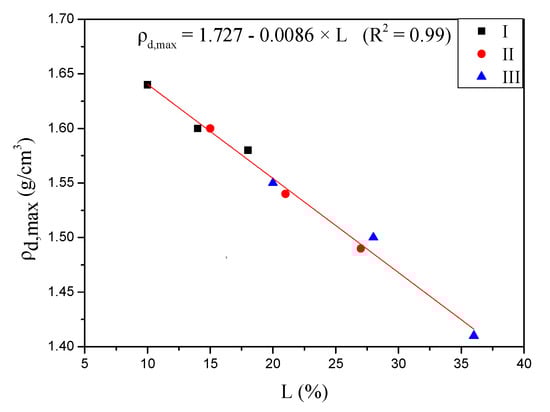 The results on dry density versus moisture content obtained from compaction tests of lime–slag stabilized loess with various mix ratios are plotted in Figure 2. It can be seen that an increase in moisture content yields the rise of dry density through its maximum value (i.e., maximum dry density). The moisture content corresponding to the maximum dry density is defined as the optimum moisture content [,,,]. However, the dry density dropped with increasing moisture content beyond the optimum point (i.e., wet side of the compaction curve). Key parameters (i.e., optimum moisture content ωopt and maximum dry density ρd,max) obtained from the compaction tests are listed in Table 5, which indicate that the average optimum moisture content increases with binder content, while the average maximum dry density decreases with the binder content. These results also imply that after lime and slag were added to the loess, more water was needed to achieve the optimum density as water was required to react in the hydration process. The decrease in maximum dry density is related to the flocculation of soil particles and the production of cementitious compounds []. When lime was added to loess with water, cation exchange of calcium quickly occurs in the lime–soil mixture, which causes flocculation of inter-particles and the decrease of loess plasticity, and thus results in extra effort required to compact the mixture []. For each category (I, II, and III), the maximum dry density was found to be increased with the slag ratio. This is due to the fact that slag possesses higher specific gravity than lime. Figure 3 shows the effect of lime content on the maximum dry density. For all three types of soil under investigation, it was found that the value of ρd,max drops with the lime content and increases with the slag content. The relation of the maximum dry density (ρd,max) and lime content (L) can be described by Equation (1), with a good correlation factor of R2 = 0.99.
