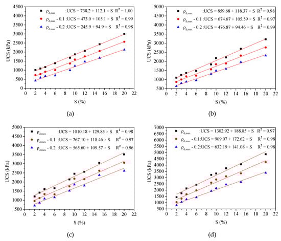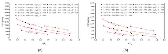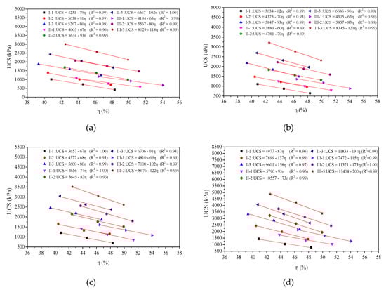Figure 7 shows that the value of η/Lv is the governing factor for UCS of lime–slag stabilized loess, and linear relationships can be obtained between UCS and η/Lv for each case. A similar trend can be found for other soil types previously investigated by other researchers [,,,].