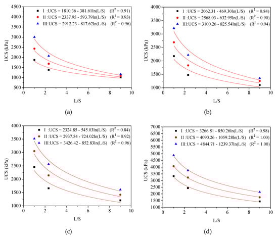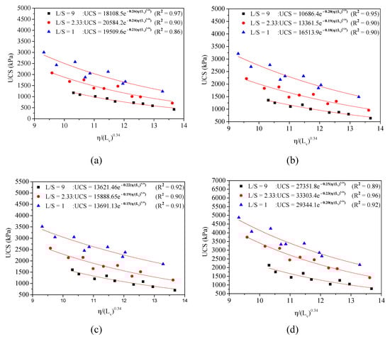 As illustrated in Figure 8a, at three curing days, the correlation between UCS and η/(Lv)0.34 with various L/S ratios (9, 2.33, and 1, respectively) could be represented by Equation (4)–(6), respectively: