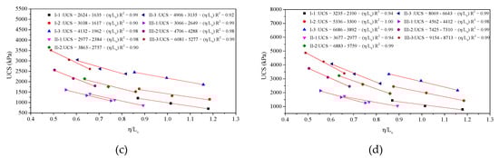 For specimens cured to five days, Figure 8b exemplify that the relationships between UCS and η/(Lv)0.34 can be represented through Equation (7)–(9):