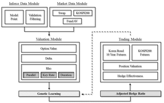 In this section, the GA-dynamic guaranteed option hedge system procedure is described. Our hedge system consists of three phases: a data module construction, a valuation module construction, and an optimizing hedge ratio. The overall structure of the GA-dynamic hedge system is presented in Figure 1.