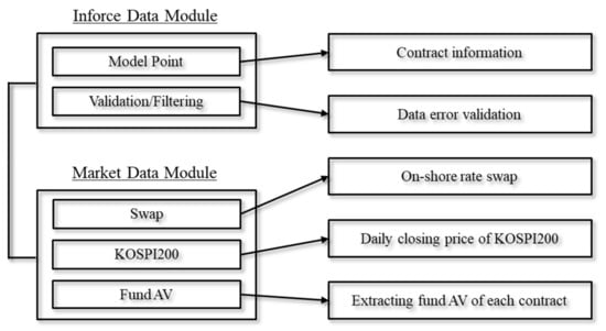In this phase, a complete data module consists of an inforce data module and a market data module. The inforce data module has two parts: the model point and validation/filtering parts. The model point part includes the actuarial information such as the age, gender, insurance fee, and premium payment period. The validation/filtering part includes the information related to data error validation, and this part is synchronized with the SQL server. During this process, the logical flaws in the actuarial information are searched for, and they are modified when found. The market data module is classified into three parts: the swap, KOSPI200, and fund AV (account value) parts. The swap data include the daily closing price of the Korean Won (KRW) on-shore interest rate swap, which is an agreement between two counterparties to exchange cash flows (fixed vs. floating) of the same currency using the Bloomberg terminal. The KOSPI200 data include the daily closing price of the KOSPI200 index, and the fund AV of each contract is extracted at this part. The data module construction process is shown in Figure 2.