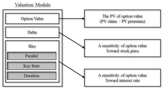 The valuation module includes various factors for hedge trading, such as the option value, delta, and rho. The option value is the present value (PV) of the guaranteed option, and it is calculated by subtracting the PV of the premium from the PV of the claim. The delta indicates the sensitivity of the option value to stock prices. In other words, the delta is the ratio of the change in the option value to the change in the price of the KOSPI200 index. For example, a delta of 0.7 indicates that for every 1% increase in the KOSPI200 index, the option value will increase by 0.7%. The rho represents the sensitivity of the option value to interest rates. The valuation module construction process is displayed in Figure 3.