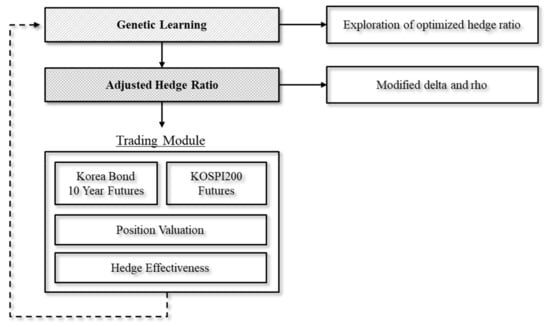 where , is the profit of the hedge trading at time t, is the profit from delta hedge trading, is the profit from rho hedge trading, and is the guaranteed option value at time t. The delta and rho hedge ratios are used as investment weights on the KOSPI200 futures and Korea bond 10-year futures, respectively. We apply a genetic algorithm heuristic trading method for the optimization of a non-linear problem for each system to improve the hedge effectiveness. The hedge ratio optimization process is shown in Figure 4.