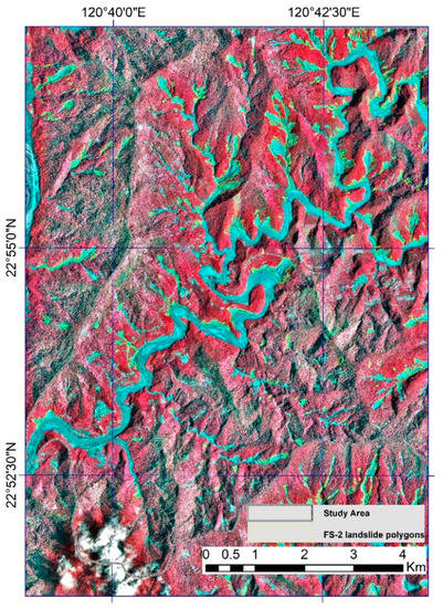 Landslide inventory maps were obtained from the Forestry Bureau of Taiwan, which were generated by extrapolating data from Formosat-2 imagery [24] with the use of an automatic image processing system (FS-2 AIPS) [25]. The Expert Landslide and Shaded Area Delineation System (ELSADS) [26,27] uses values of reflectance in the red and near–infrared spectra to develop a normalized difference vegetation index (NDVI) to represent the geospatial changes in the vegetation cover. Because landslide activity is common on sloping terrain, the ELSADS enables the interpretation of images with the support of a digital terrain model (DTM) for the corresponding area. The ELSADS enables users to assess other geospatial information maps (e.g., geology maps, land use maps, previous imagery) to clearly interpret non-landslide, shadow, and dark areas and to confirm that a non-vegetated area is correctly interpreted as a landslide polygon [26]. Furthermore, image processing involves acquiring two suitable image sets with temporal differences—typically “before” and “after” images that can be overlain to determine differences in vegetation that has been disturbed as a result of landslide activity. For example, the output inventory map of Maolin District shows (Figure 3) landslide polygons identified in non-vegetated areas on sloping terrain, while differentiating the landslides from flat terrain, roads, riverbeds, and buildings. In this study, a nine-year landslide inventory dataset (2004–2012) was examined.