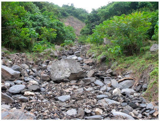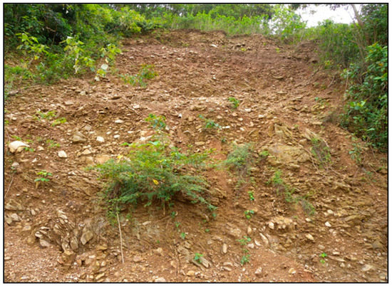 The analysis of the geology and geomorphology of Maolin District reveals that the combination of the two factors played an important role in the frequency and location of the slope failure activity in the study area. The geologic influences indicate that three major rock types are present there: slate, sandstone, and phyllite. Similarly, soil conditions in the study area are generally shallow, poorly sorted, and lacking defined soil horizons. For example, poorly sorted colluvial-type sediments are shown in Figure 6.