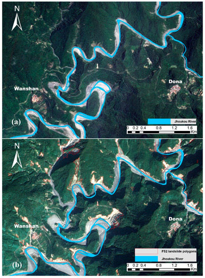 FS-2 images of the study area after Typhoon Morakot (a) FS-2 image (20080622); (b) FS-2 image (20101121). Meander examples and related landslide polygons, Wanshan Village.