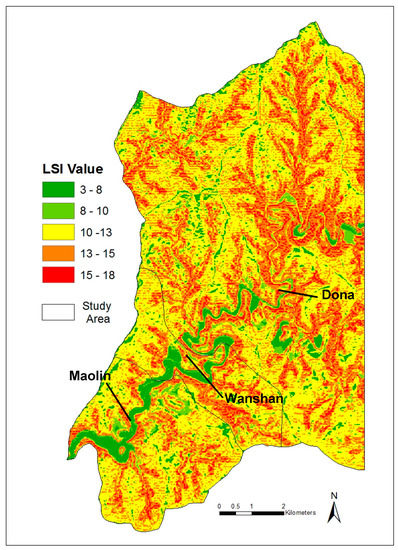 The results of the landslide susceptibility index modeling of Maolin District show that the land conditions of slope, curvature, distance to river, and rock strength strongly influenced hazard-prone areas (Figure 9). Low LSI values indicated low landslide susceptibility, whereas high values represented areas of high susceptibility. Furthermore, very low (dark green 3–8) to low (green 8–10) LSI values occurred along the riverbed, which corresponded with the low slope gradient found along the base of the Jhoukou River channel. The very low to low LSI values followed a pronounced meander pattern as the river drained to the southwest. Similarly, in the upper reaches, very low to low LSI values were confined to very narrow sections of the river channel; however, as the river drained to the southwest, the river channel widened, as did the meander, which created a broad channel morphology. Medium LSI values (yellow 10–13) dominated the study area model. Such values were located in hilly terrain away from the main river channel. Similarly, medium values occupied the mountain ridge lines that run parallel to the drainage pattern of the study area. High (orange 13–15) to very high (red 15–18) LSI values were located in areas where steep gullies were present. In the upper reaches of the basin, there was a dendritic pattern visible in relation to the high to very high LSI values. Further investigation indicates that such a pattern corresponded with steep first- or second-order channels found in this portion of the study area. Importantly, high to very high LSI values were found along the margin of very low to low values, as well as near the inner and outer bend of meanders along the Jhoukou River channel.